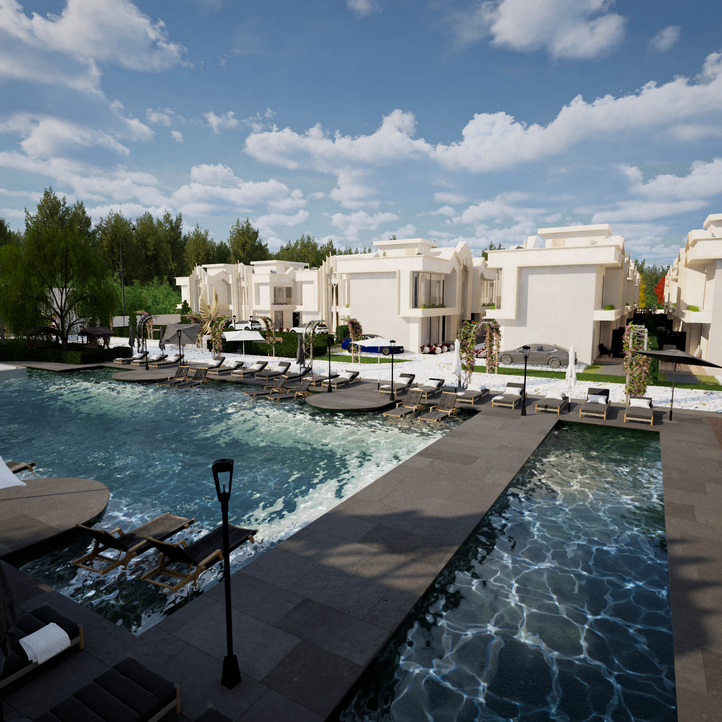 Geniş havuz alanı, modern deck tasarımı ve su içi şezlonglu dinlenme bölümleriyle her gün resort konforunda bir yaşam.
