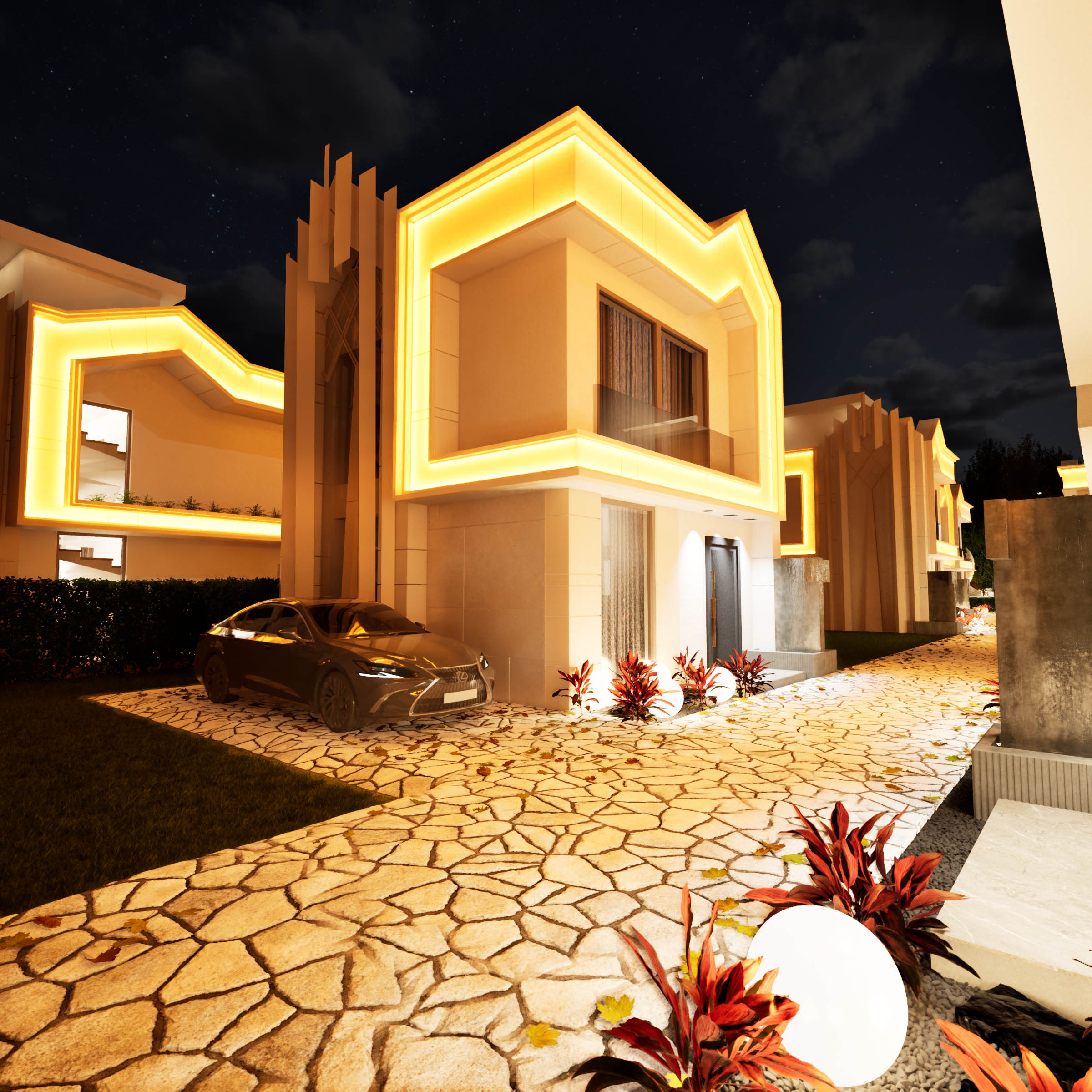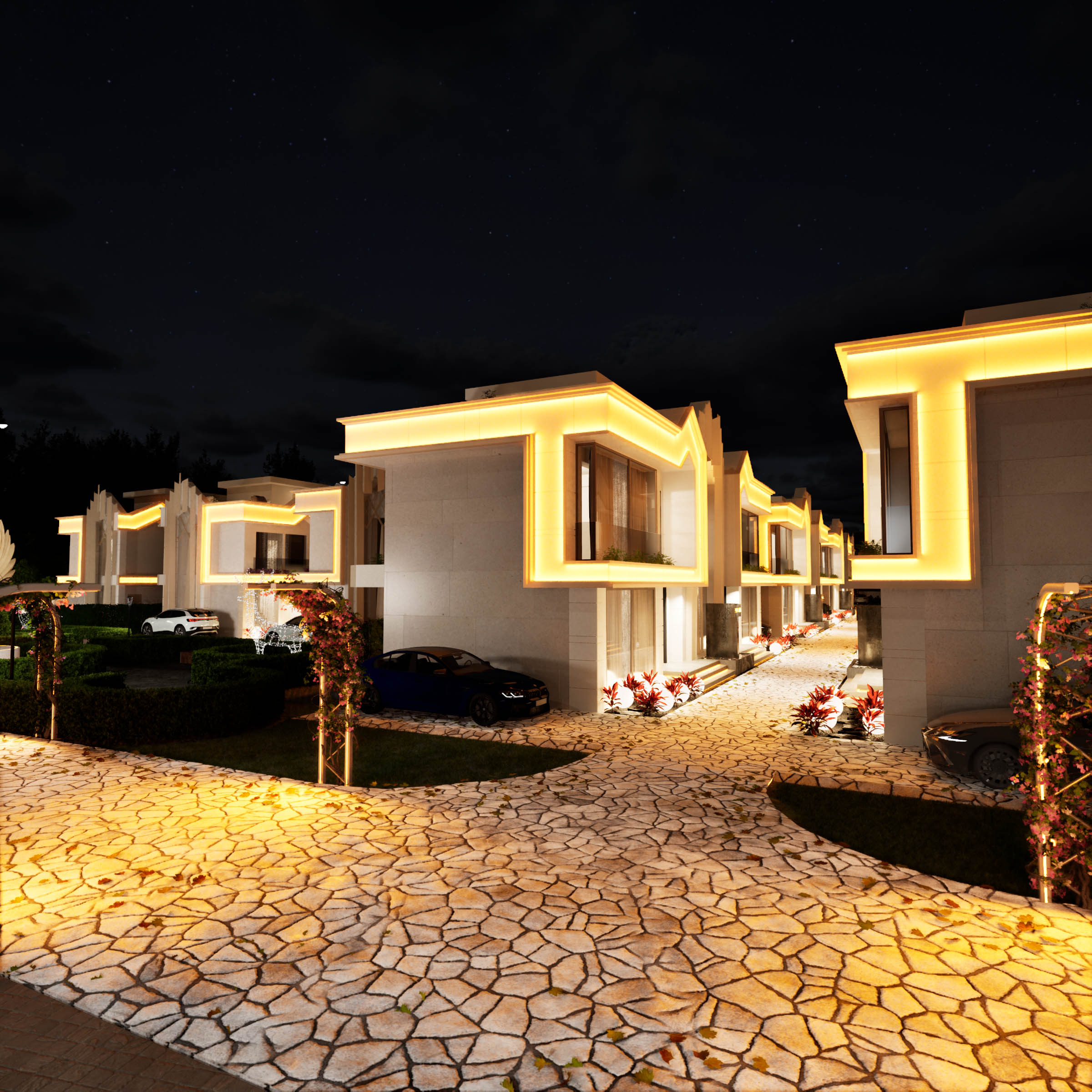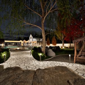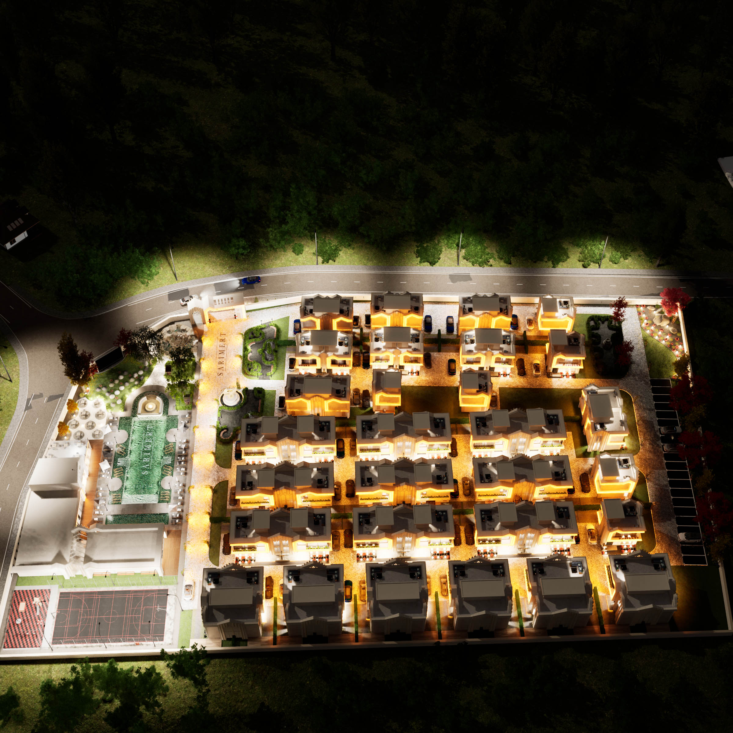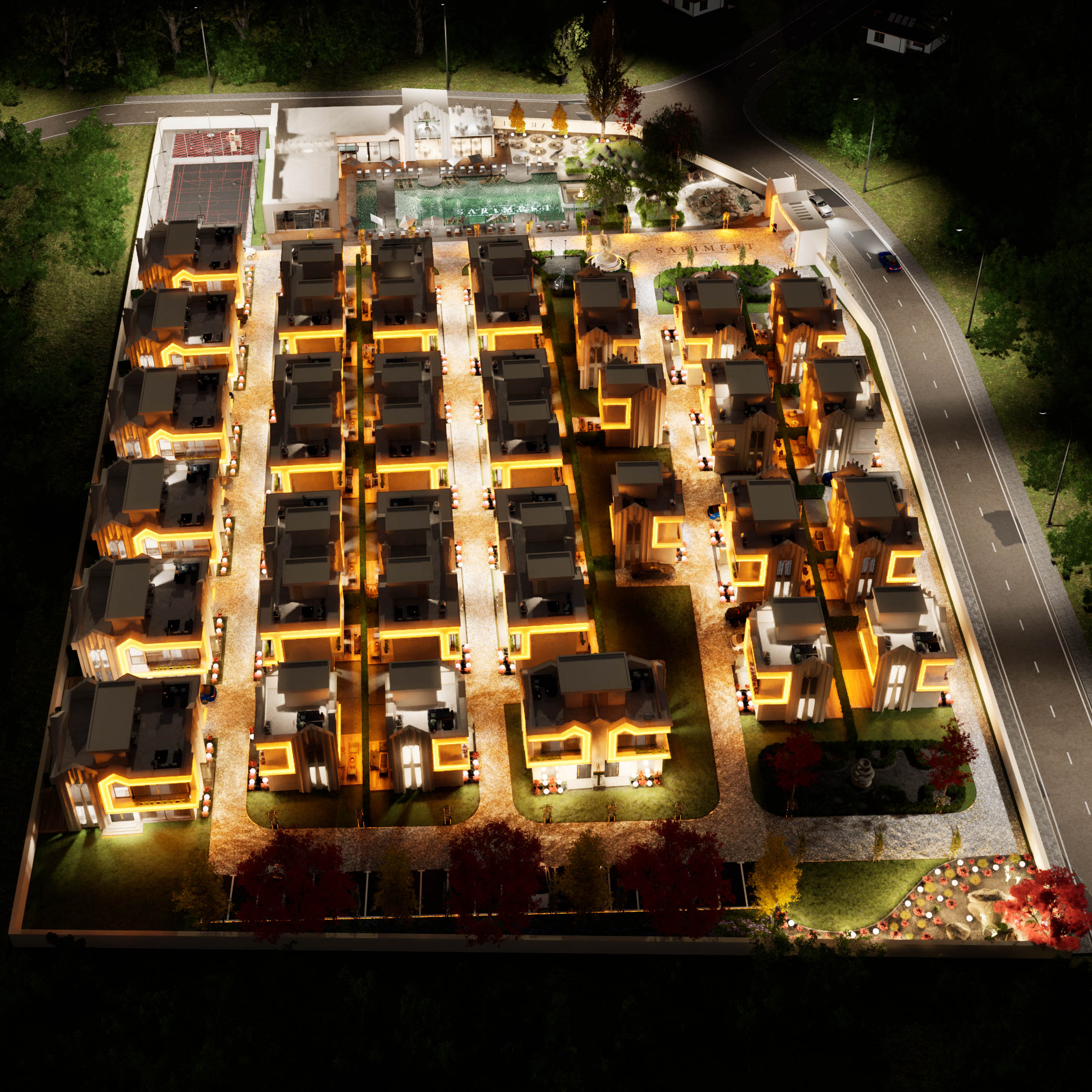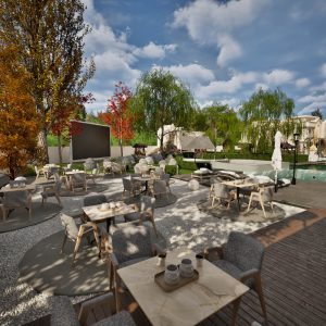 Zarif aydınlatmalarla akşamları büyüleyici bir atmosfer yaratan bu alan, projenin lüks çizgisini tamamlıyor.