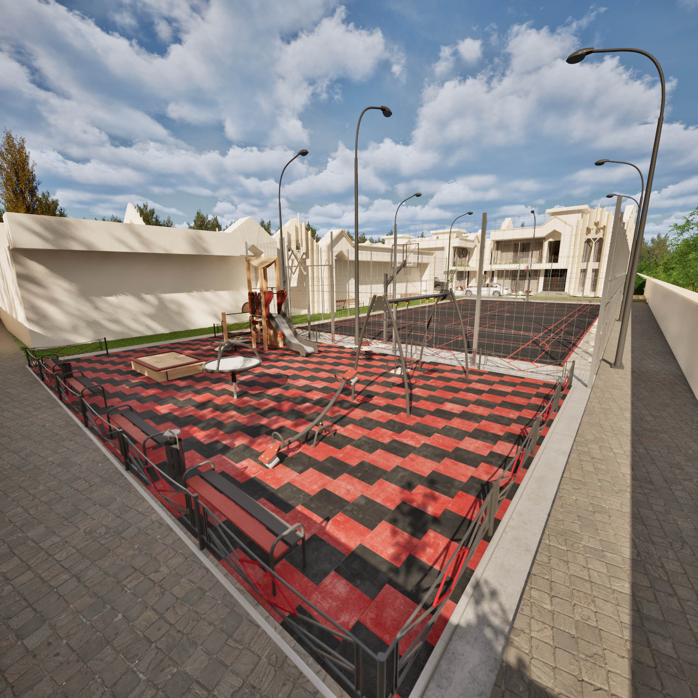 Projenin yaşam kalitesini tamamlayan çocuk oyun parkı, modern peyzaj düzeniyle site estetiğine entegre bir şekilde tasarlandı. Hem görsel bütünlüğü korur hem de aile yaşamına sıcak bir dokunuş katar. Burada çocuklar eğlenirken, ebeveynler sakinliğin tadını çıkarır.