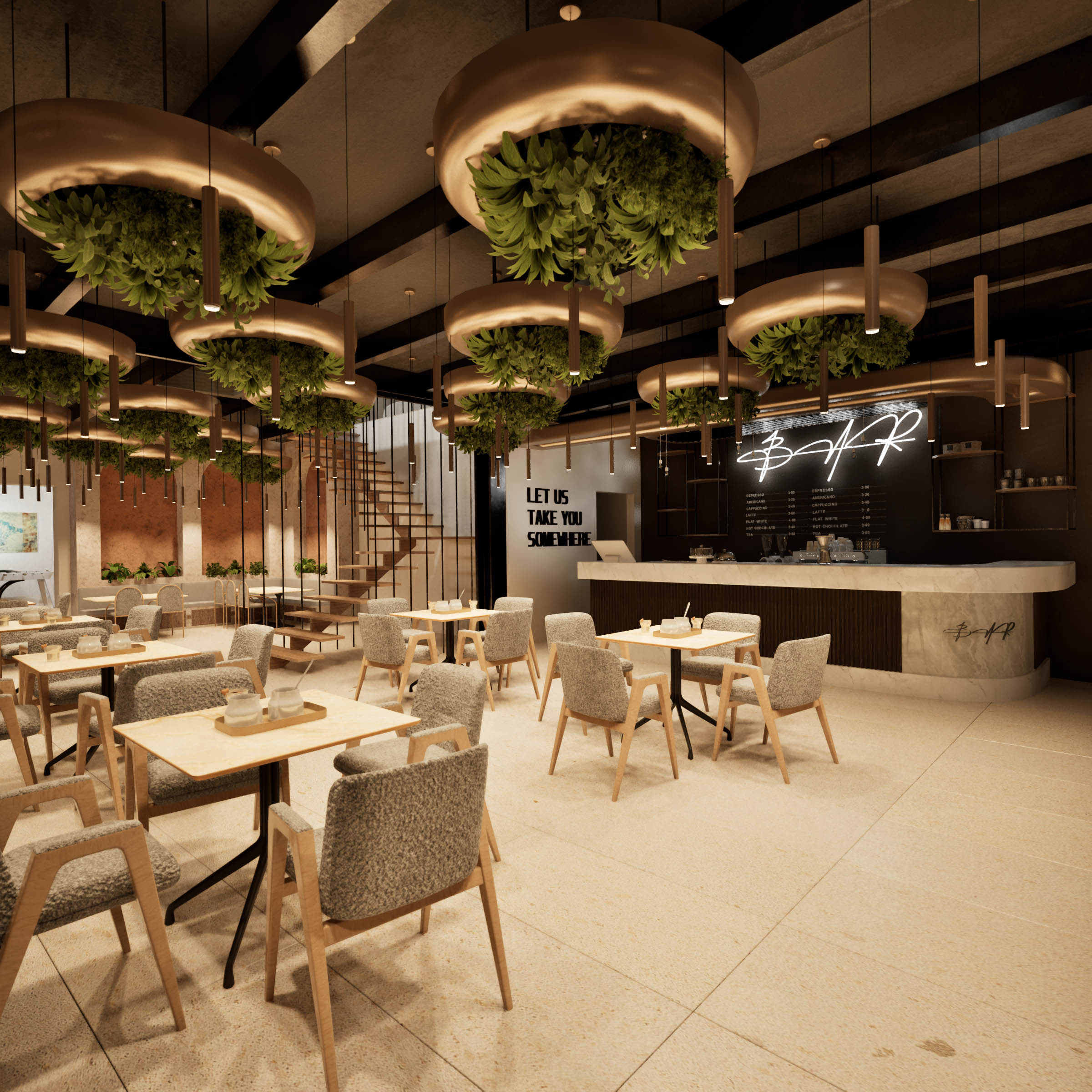 Modern yaşamın sosyal merkezi: açık-kapalı ve teraslı kafeterya. Gündüzleri güneşin tadını çıkarabileceğiniz teras alanı, akşamları şık aydınlatmalarla sıcak ve samimi bir ortam sunuyor. Hem sakinlerin hem misafirlerin buluşma noktası olarak tasarlanmış, prestijli bir sosyal deneyim alanı. Geniş iç mekan tasarımı, şık oturma düzenleri ve panoramik teras manzarasıyla kafeterya, projeye modern bir yaşam standardı katıyor. Hava koşullarına bağlı kalmadan her an kullanabileceğiniz açık ve kapalı alanlar, konforu ve estetiği bir araya getiriyor.